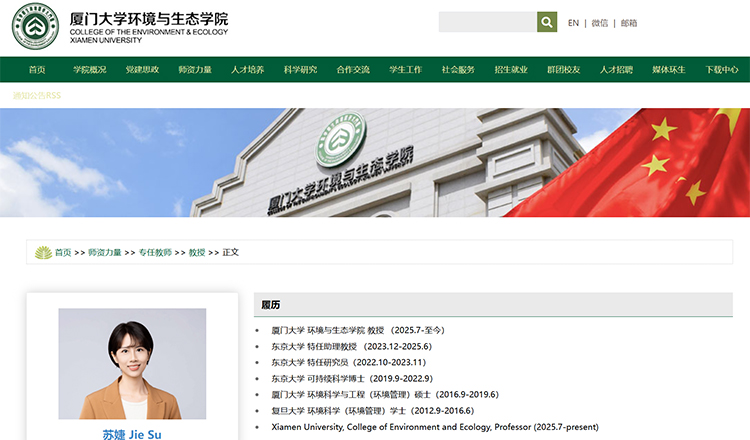 8月7日,厦门大学环境与生态学院官网显示,苏婕已任厦门大学环境与生态学院教授、博导。此前,苏婕为东京大学特任助理教授。