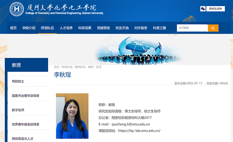 据厦门大学化学化工学院官网资料,此前担任西湖大学工学院特聘研究员的李秋珵,已于近期加盟厦门大学,担任厦门大学化学化工学院教授、博士生导师。