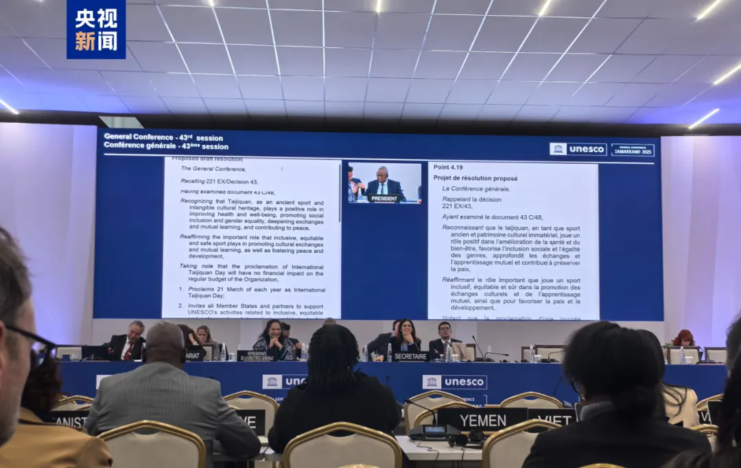 新华社北京11月5日电 正在乌兹别克斯坦撒马尔罕进行的联合国教科文组织大会第43届会议当地时间5日审议通过决议,将每年3月21日(北半球春分日)设立为“国际太极拳日”。这是联合国系统首个以武术项目命名的国际日,标志着太极拳这一中华传统体育瑰宝的重要价值获得全球广泛认可,是全球文明倡议的生动实践。